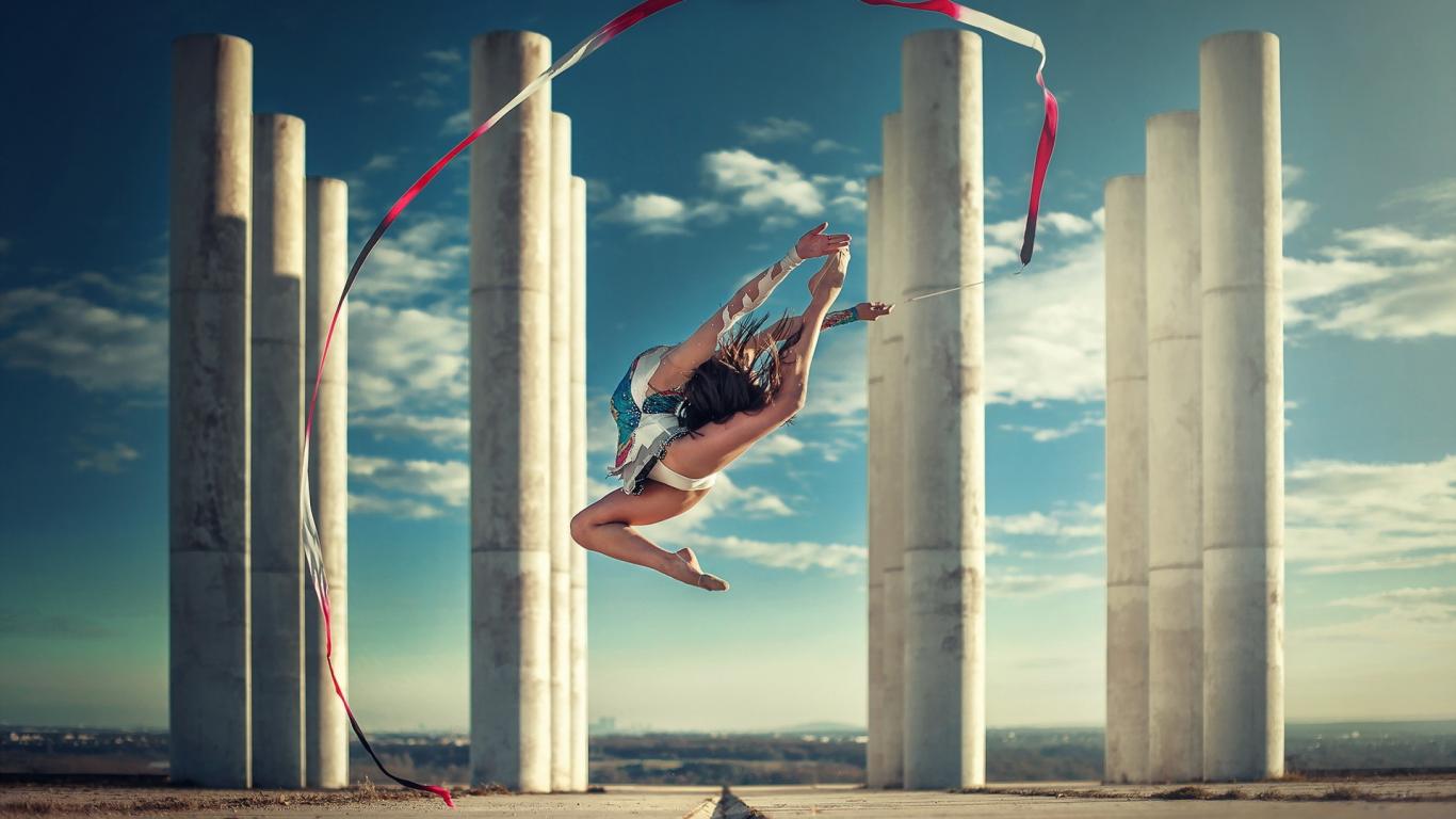 Обои Гимнастка с лентой на фоне колонн