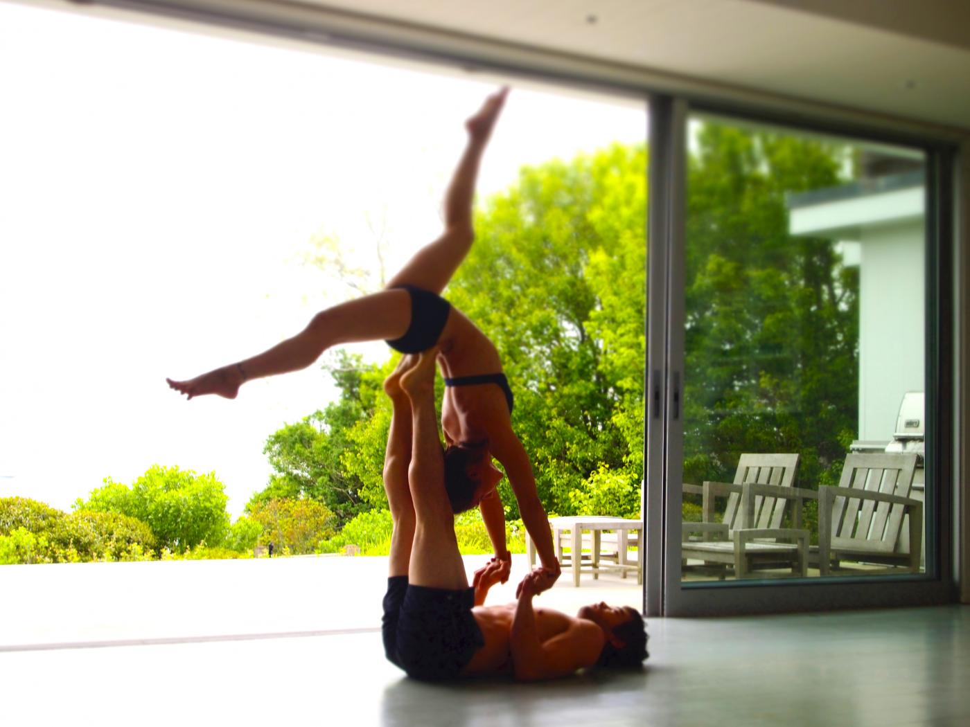 Обои Девушка занимается йогой на корзинке из супермаркета