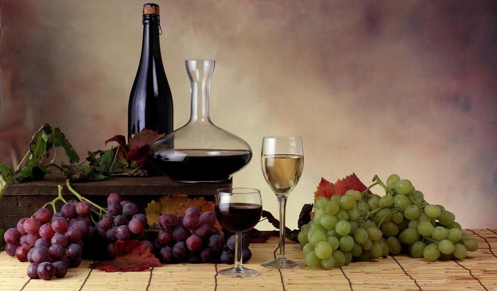 Обои Виноградные гроздья и вино