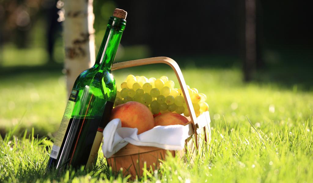 Обои Бутылка вина и фрукты на природе