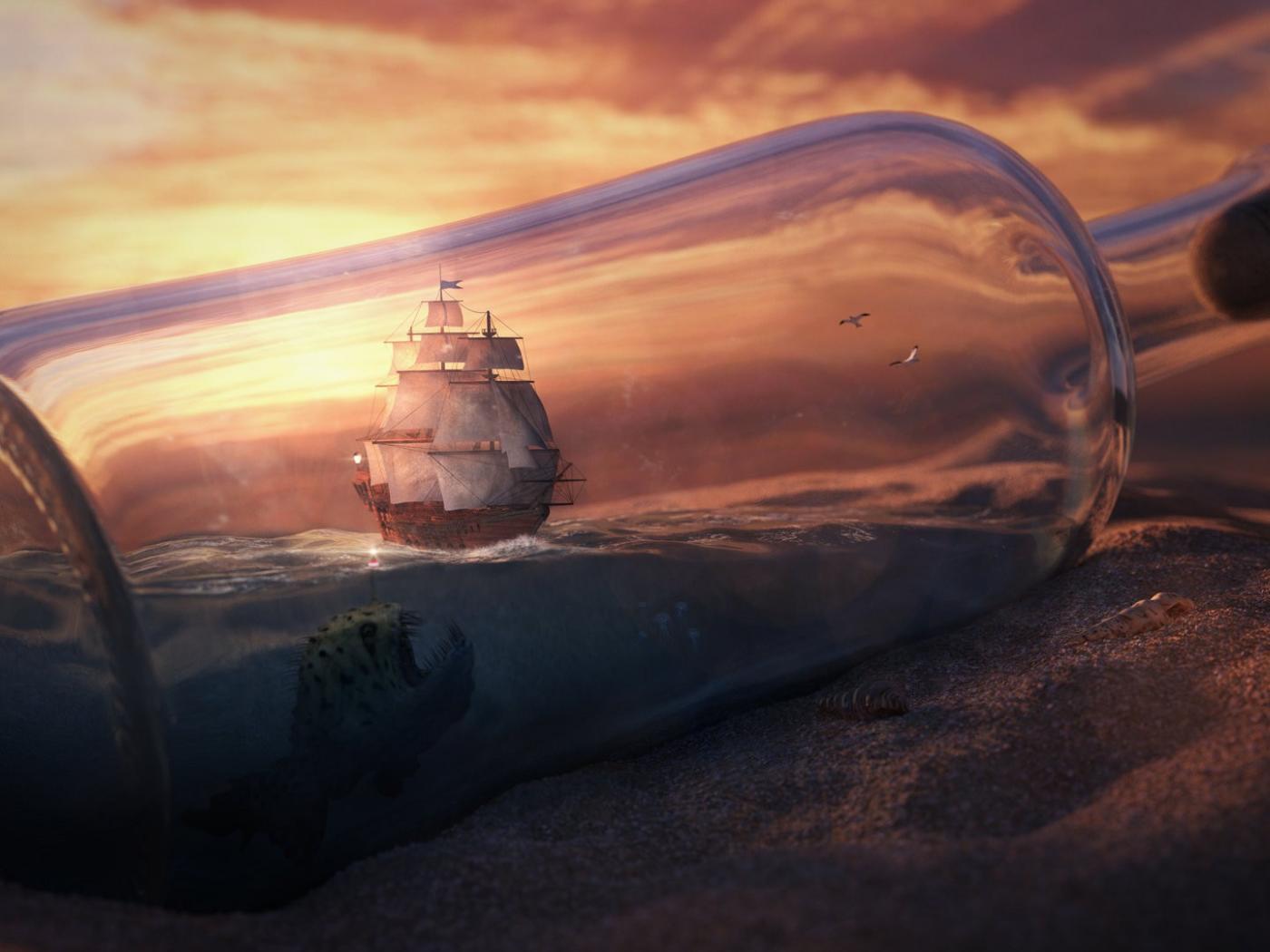 Обои Морское чудовище и корабль в бутылке