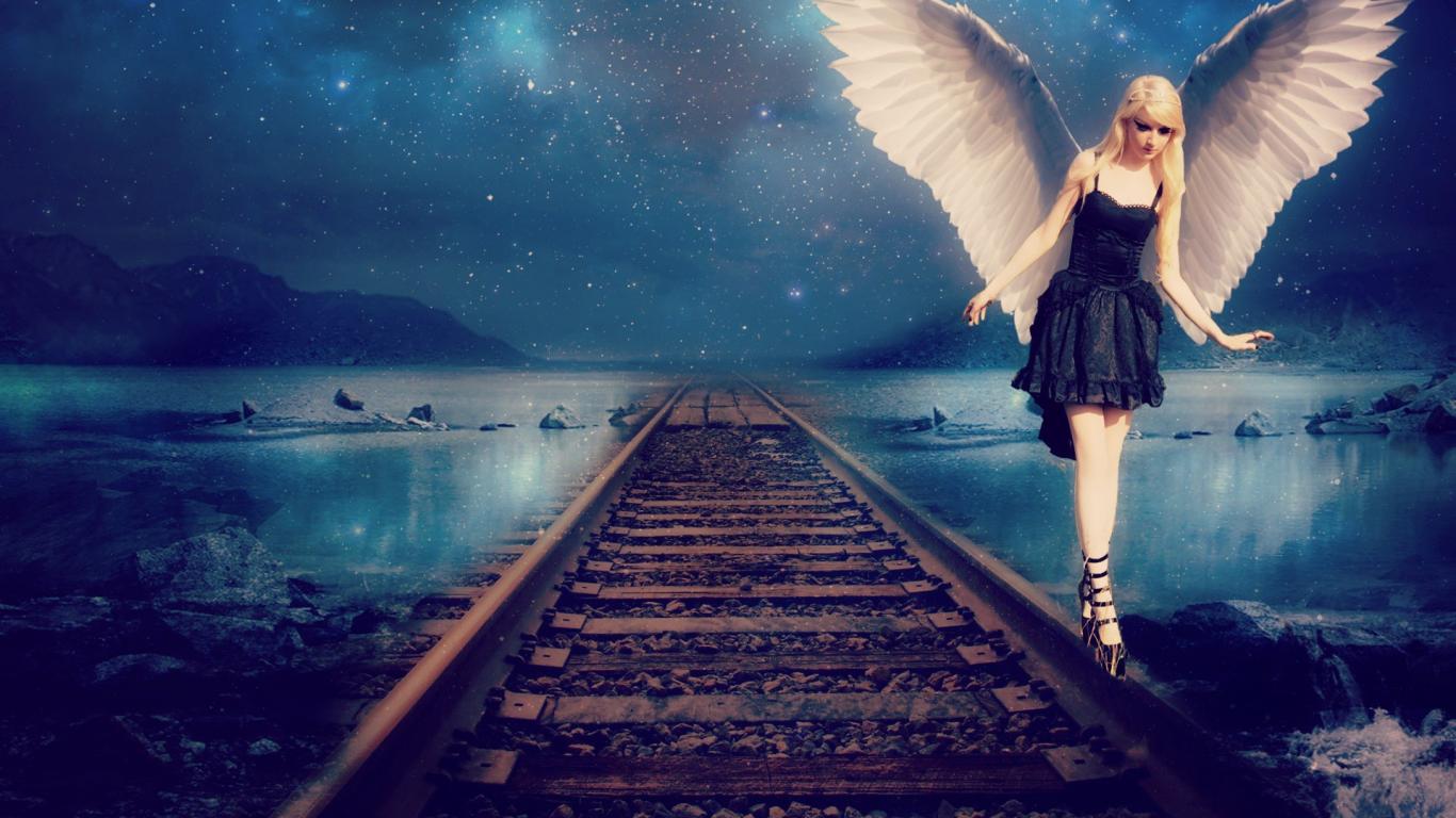 Обои Ангел идет по рельсам