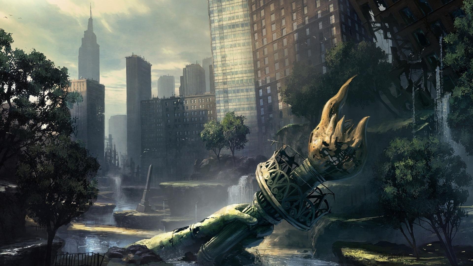 Обои Рука с факелом от статуи Свободы в руинах Нью-Йорка