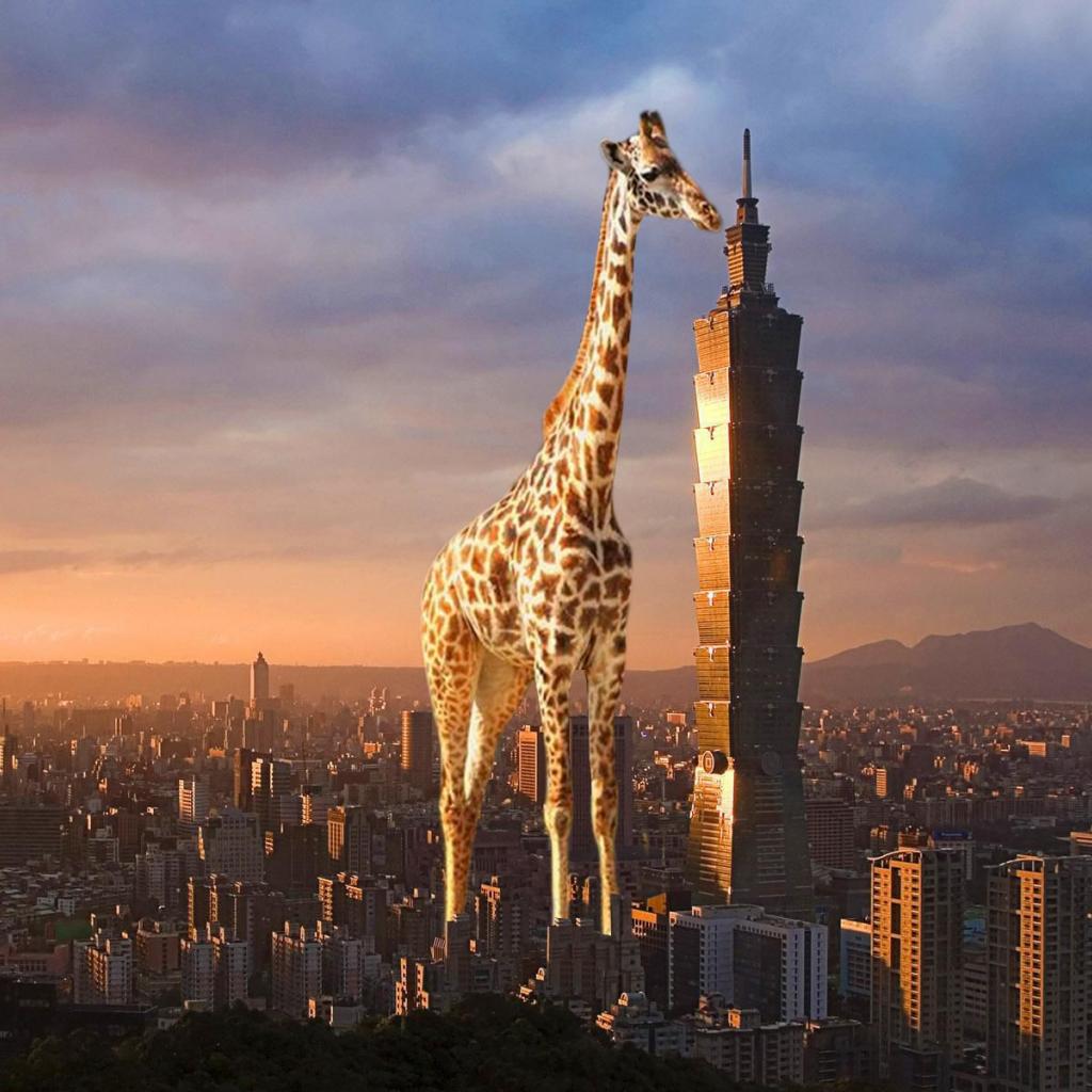 Обои Жираф выше небоскреба