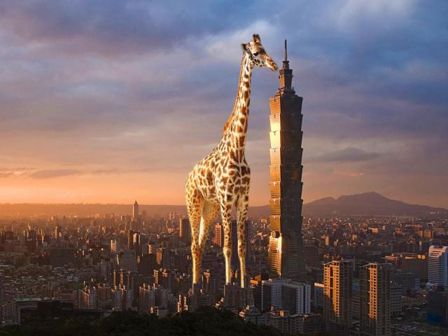 Обои Жираф выше небоскреба