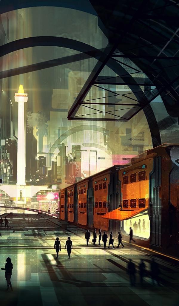 Обои Робот на перроне вокзала в городе будущего