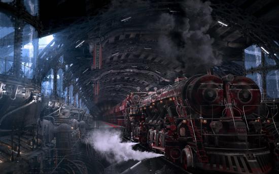 Обои Мощный локомотив на станции, стимпанк