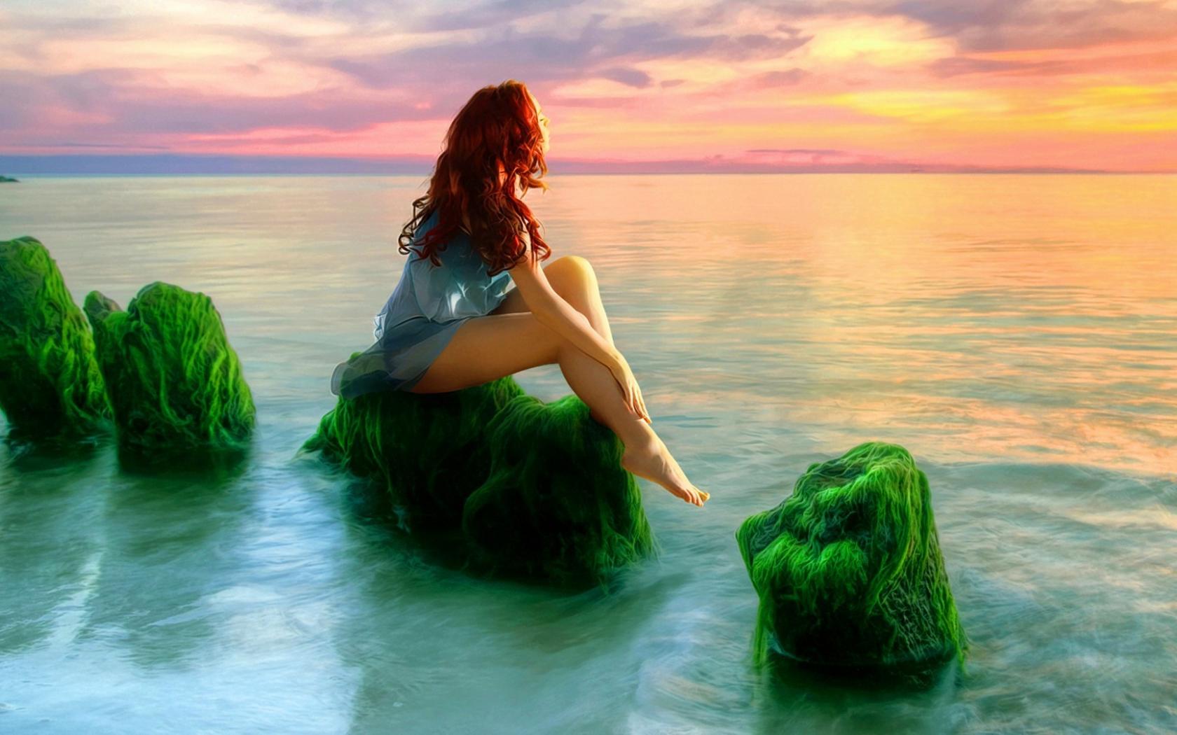 Обои Русалка на зеленых камнях смотрит на закат