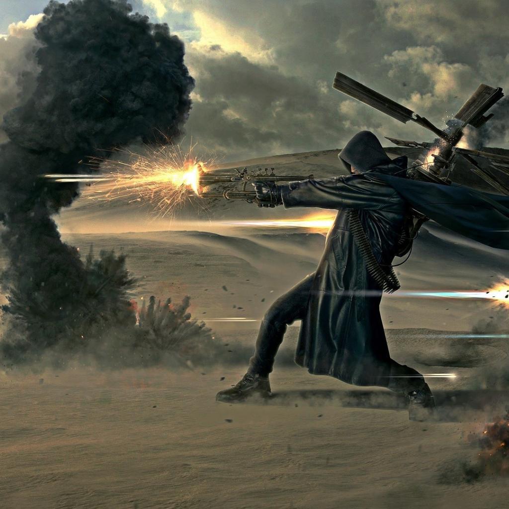 Обои Солдат в черном плаще стреляет из оружия