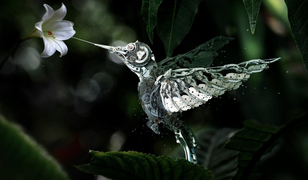 » Обои Механическая птица у цветка