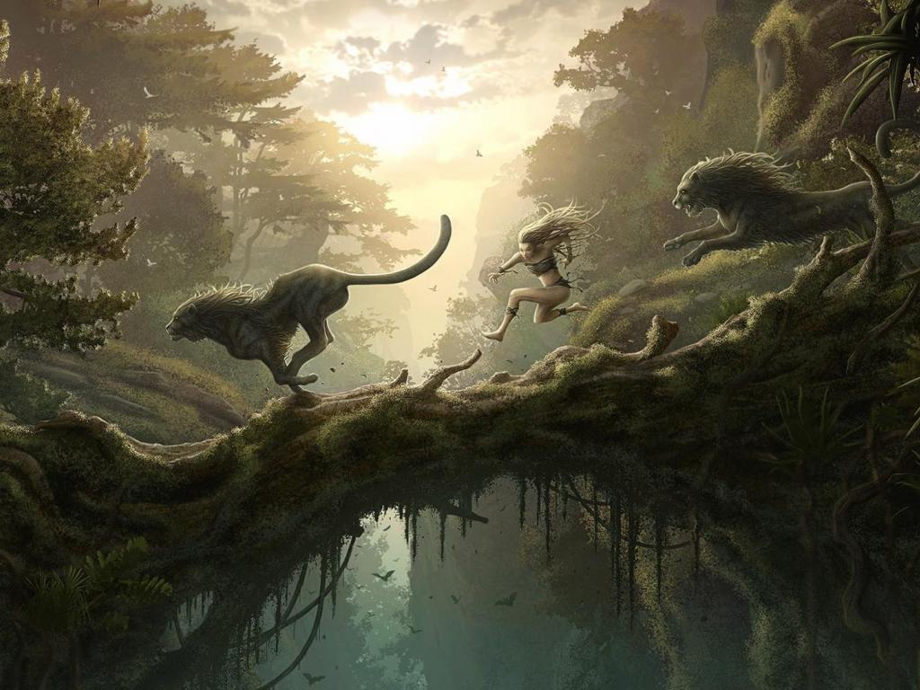 Обои Бег человека и львов