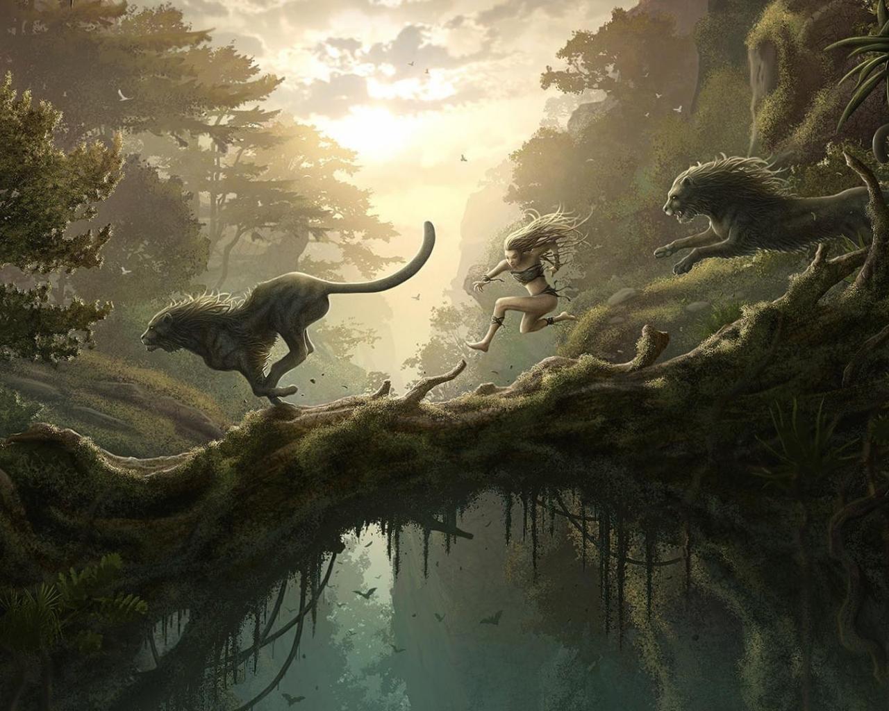 Обои Бег человека и львов