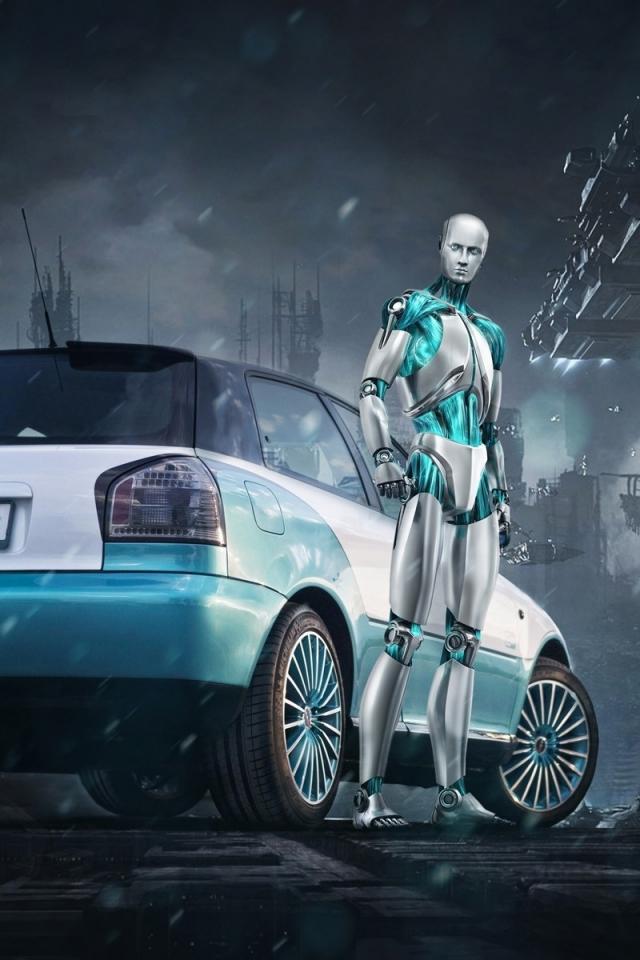 Обои Робот у автомобиля