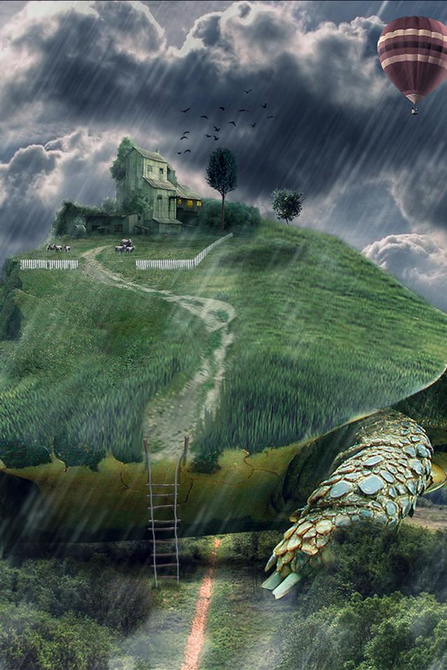 Обои Темные облака, Дом, шар, черепаха