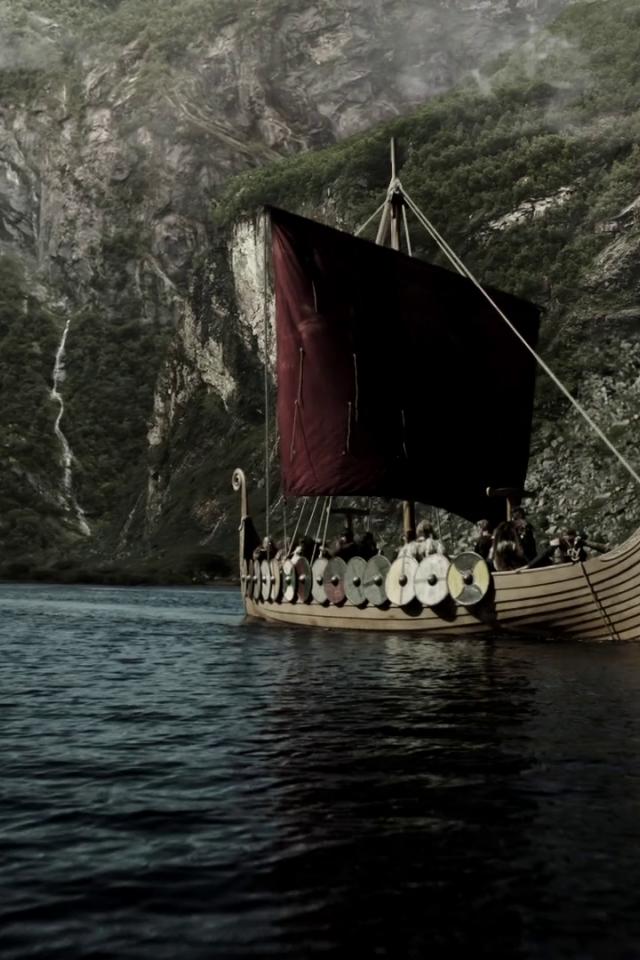 Обои Красный парус корабля викингов