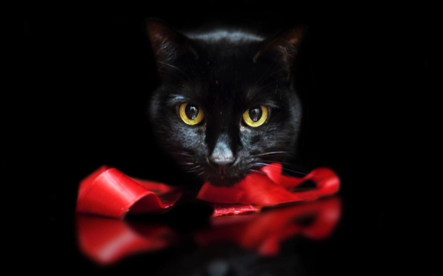 Обои Черный кот с лентой на черном фоне