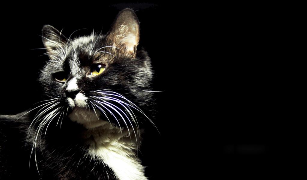 Обои Пятнистый кот на черном фоне