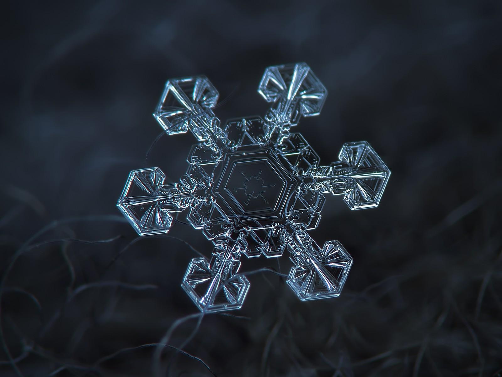 Обои Снежинка под увеличением на черном фоне