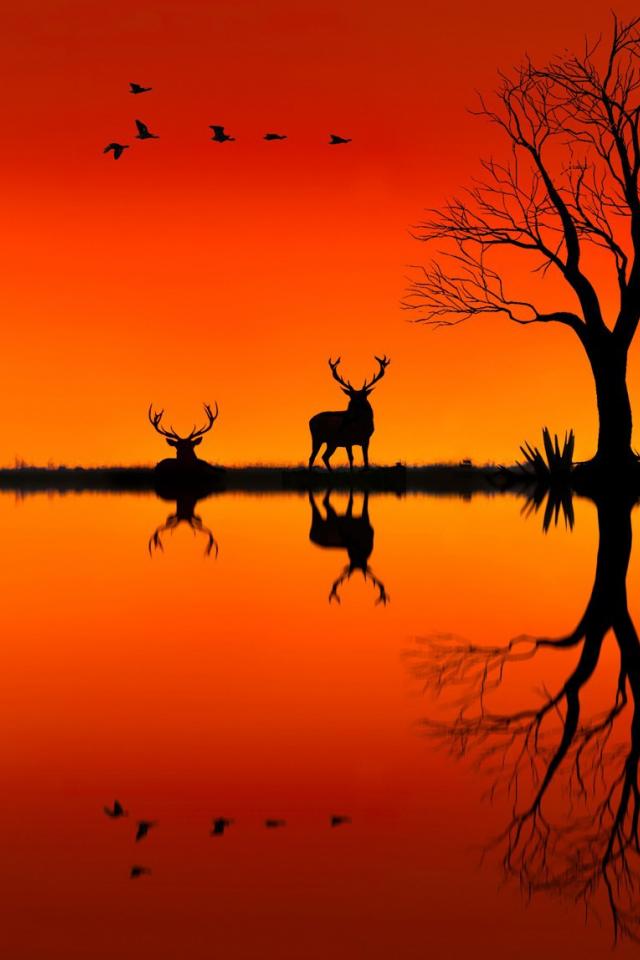 Обои Силуэты оленей на оранжевом фоне