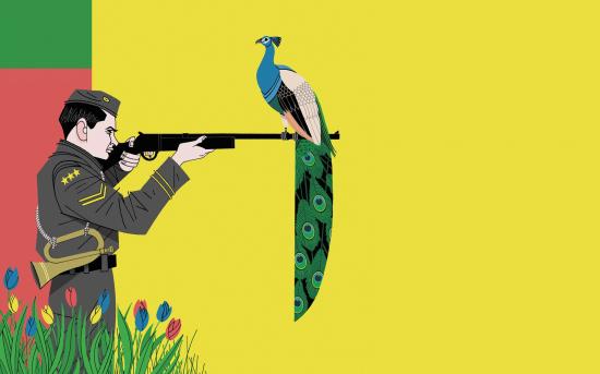 Обои Фазан на ружье охотника, желтый фон