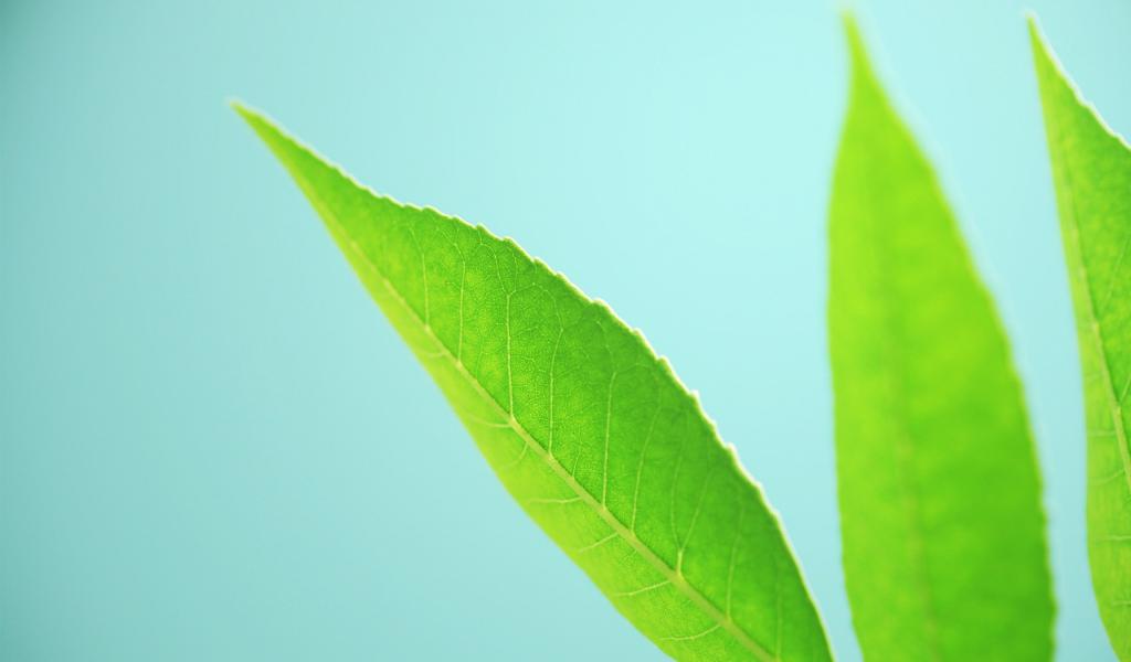 Обои Три зеленых листика на голубом фоне