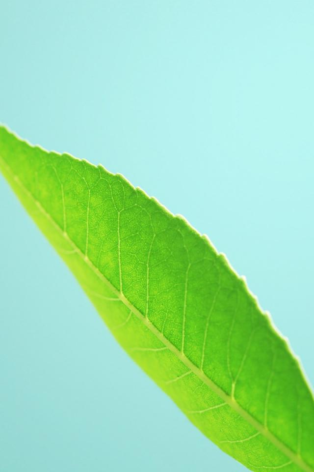 Обои Три зеленых листика на голубом фоне
