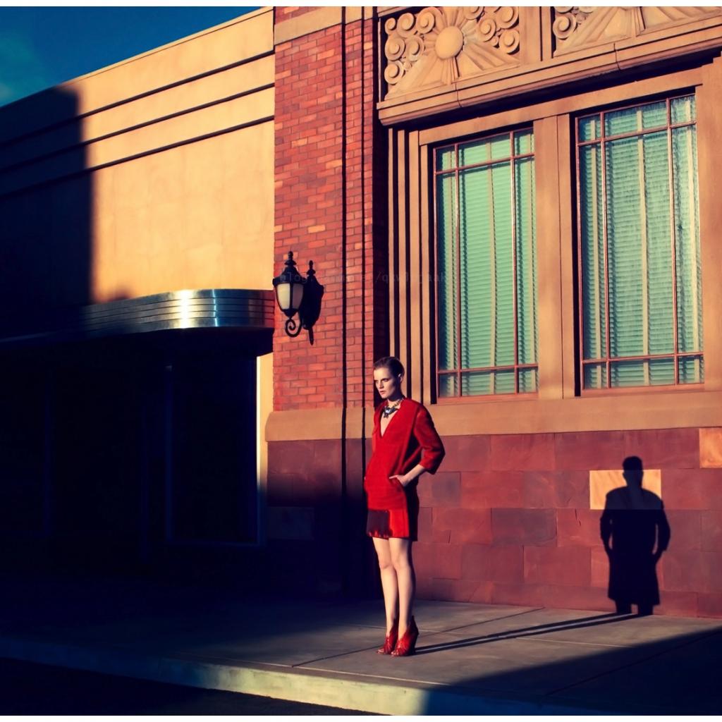 Обои Фотография девушки в красном на фоне здания