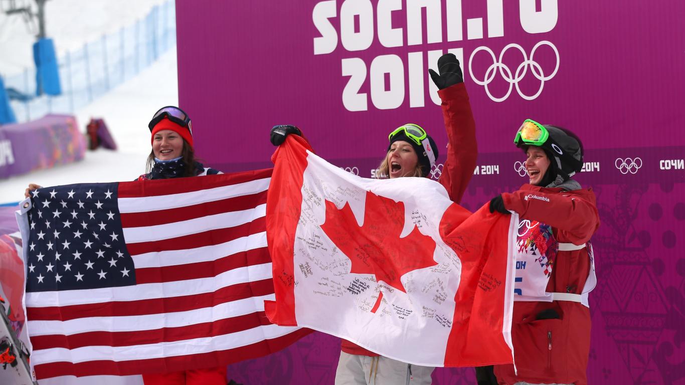 Обои Обладательница бронзовой медали Ким Ламарре канадская фристайлистка на олимпиаде в Сочи