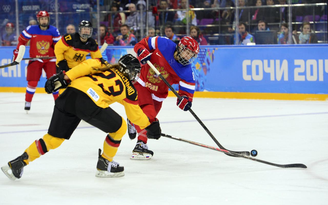 Обои Борьба за шайбу в хоккее на Олимпиаде в Сочи