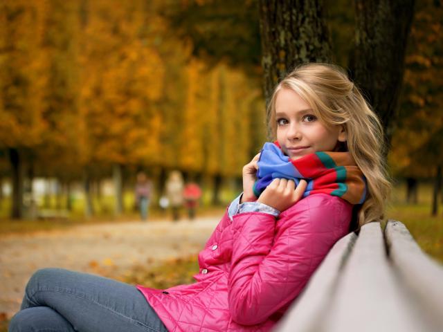 Обои Девочка, Скамейка, Улыбка, Парк