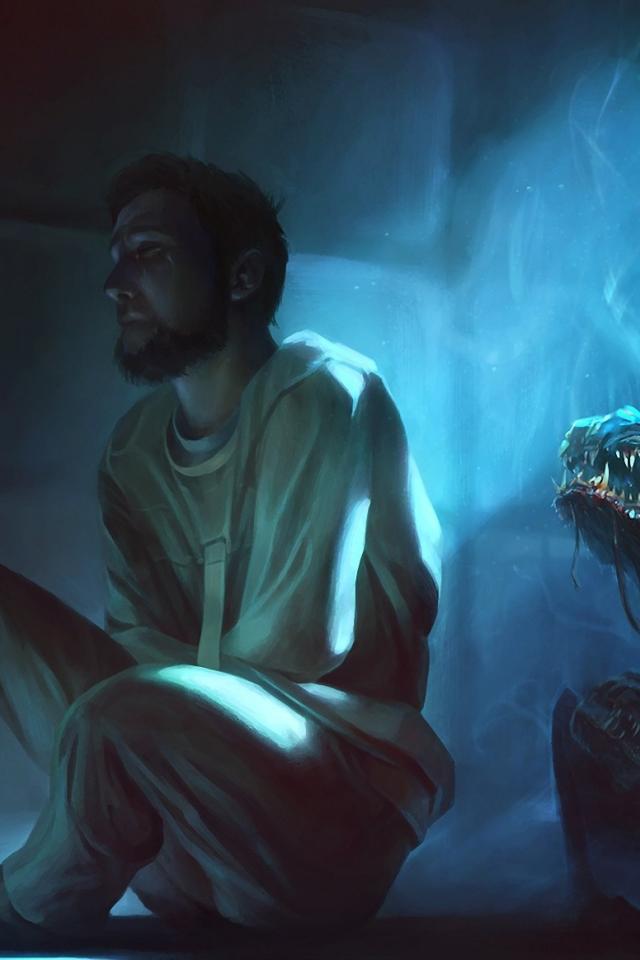 Обои Парень, Фантазия, зверь, сидит