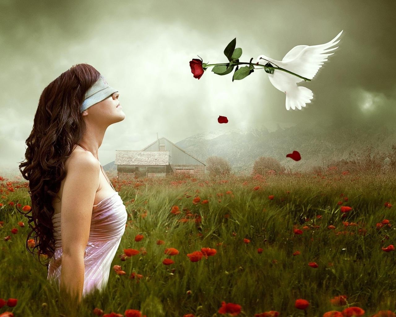 Обои Трава, Голуби, Длинные волосы