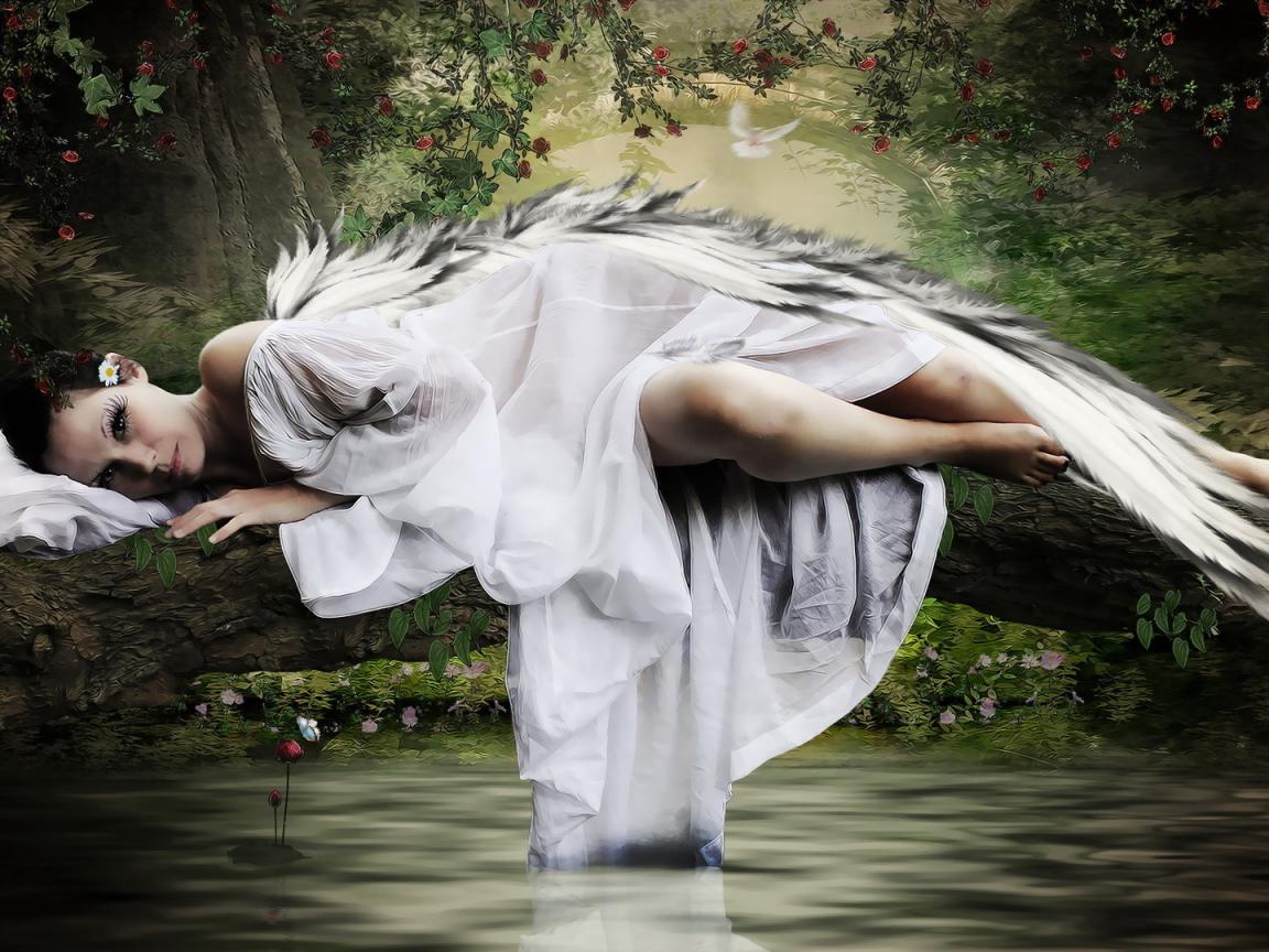 Обои Деревья, Вода, крылья, ангел