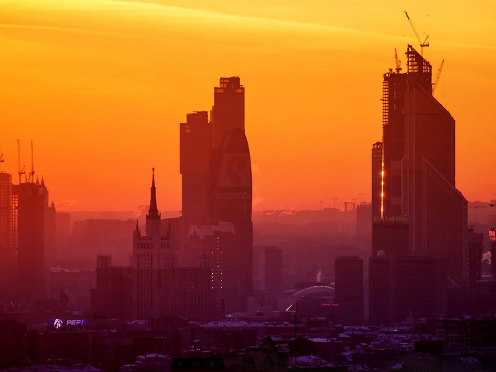Обои Стройка небоскребов на фоне оранжевого неба