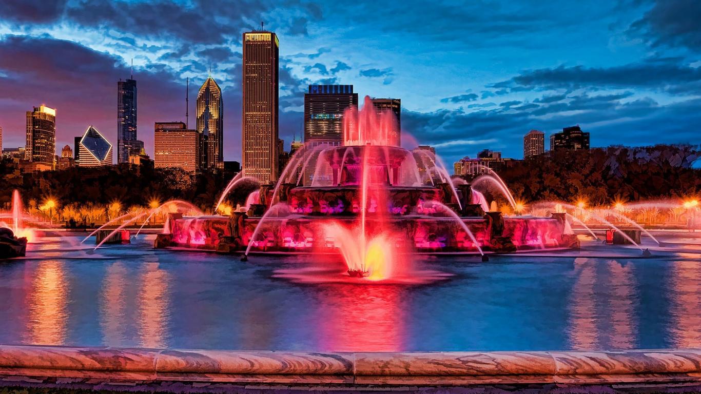 Обои Розовая подсветка фонтана в городе
