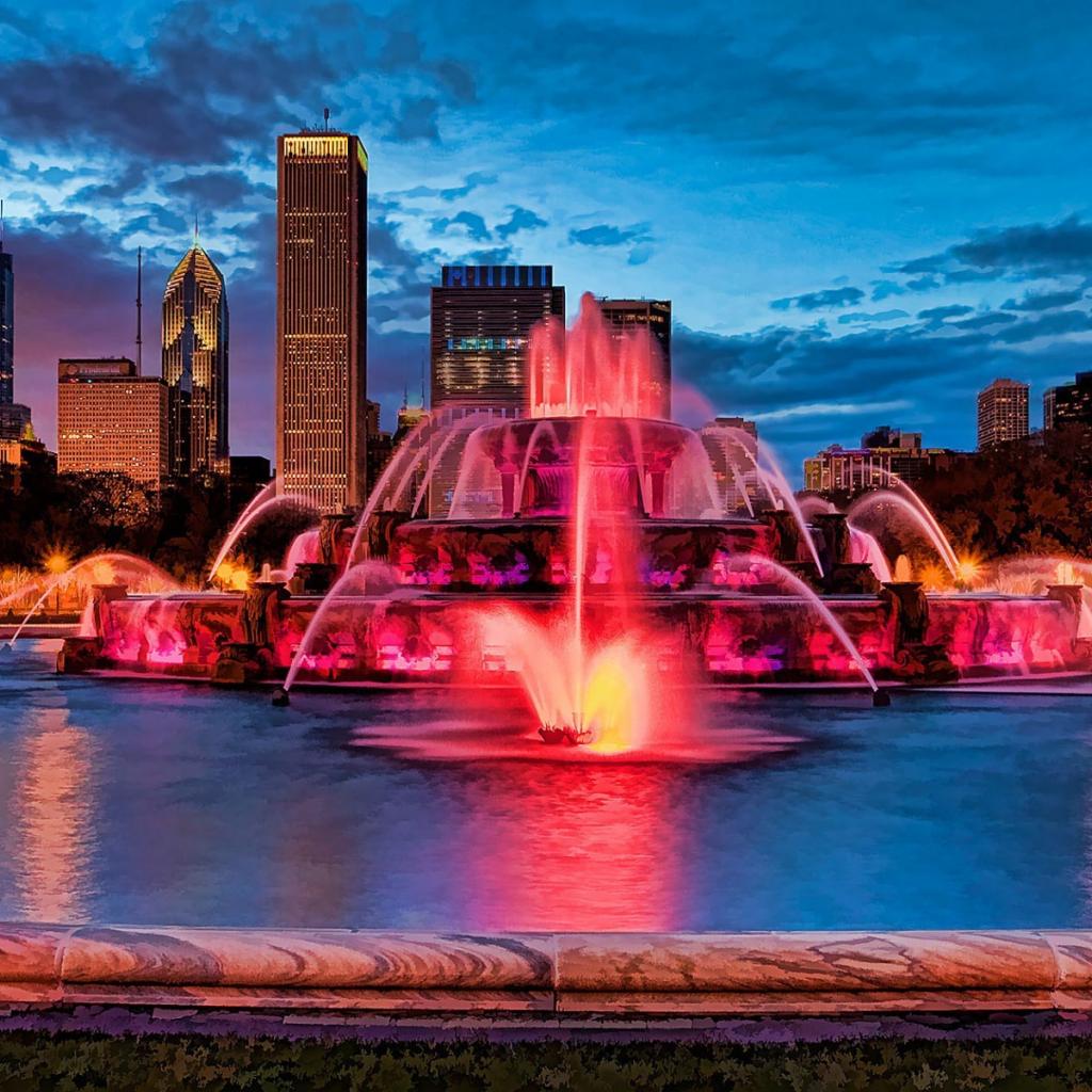 Обои Розовая подсветка фонтана в городе