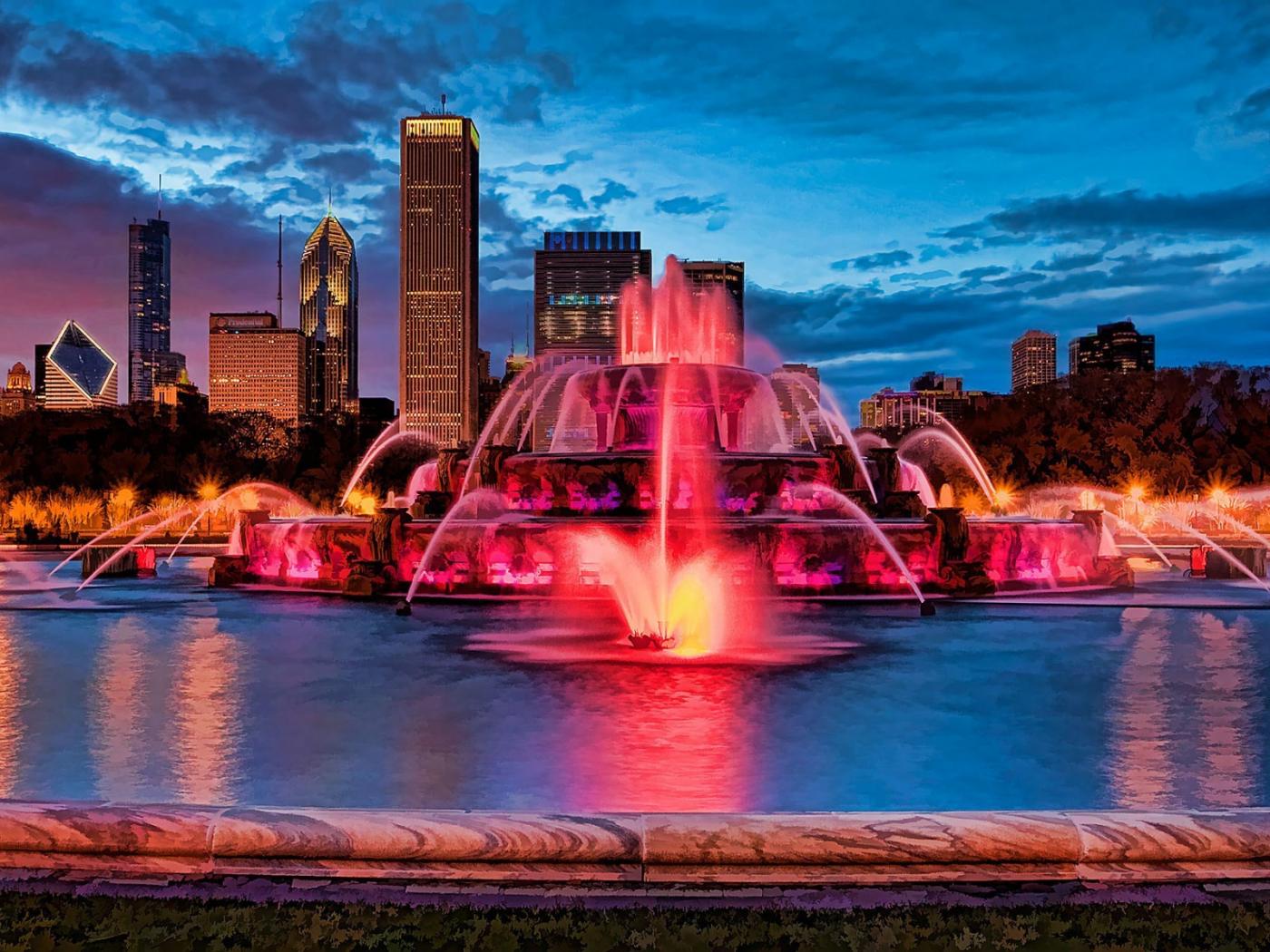 Обои Розовая подсветка фонтана в городе