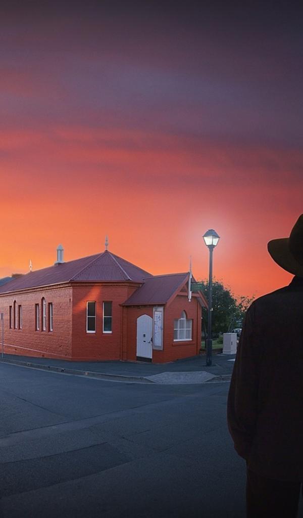 Обои Силуэт мужчины на фоне городской улицы
