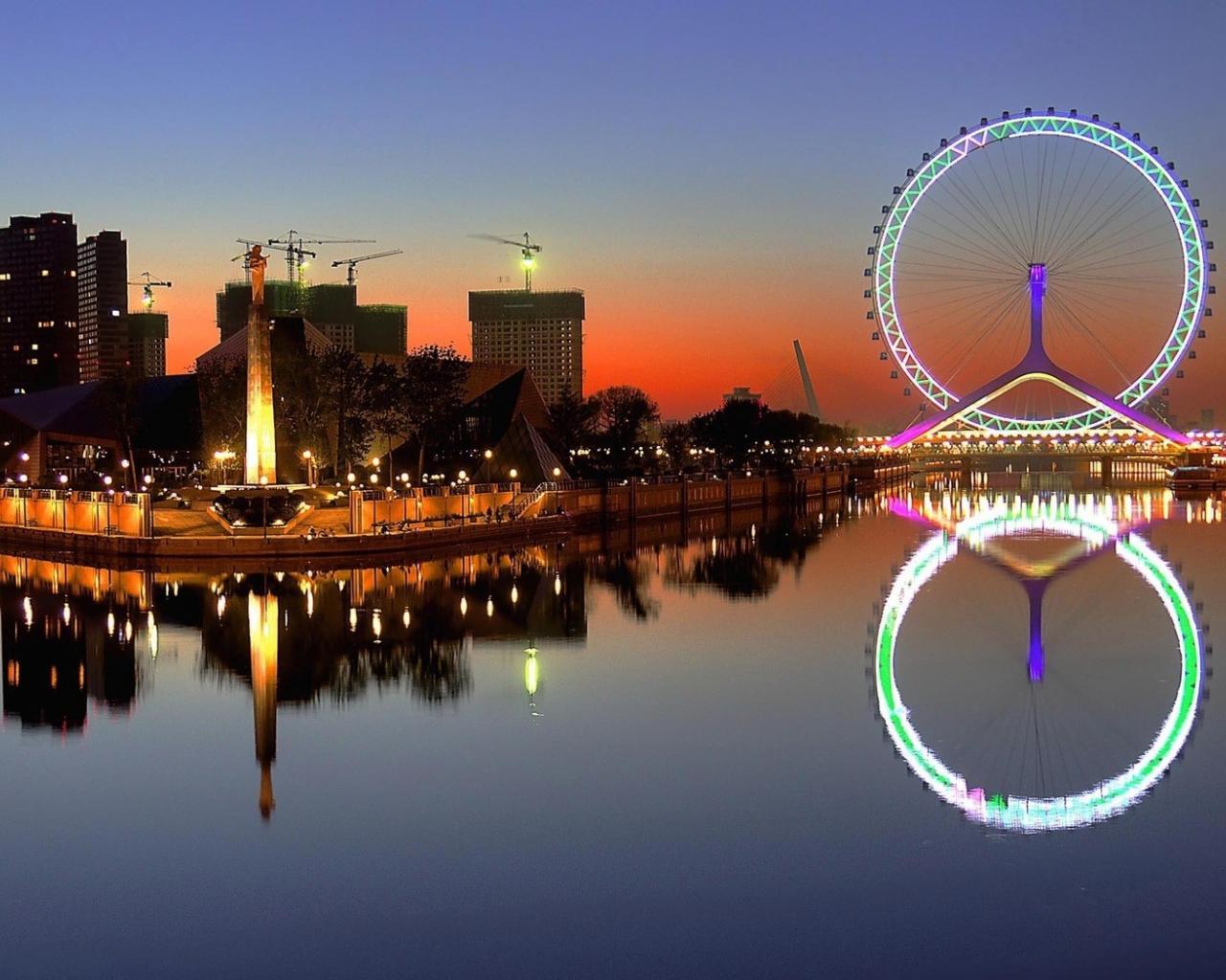 Обои Яркое колесо обозрения в китайском городе