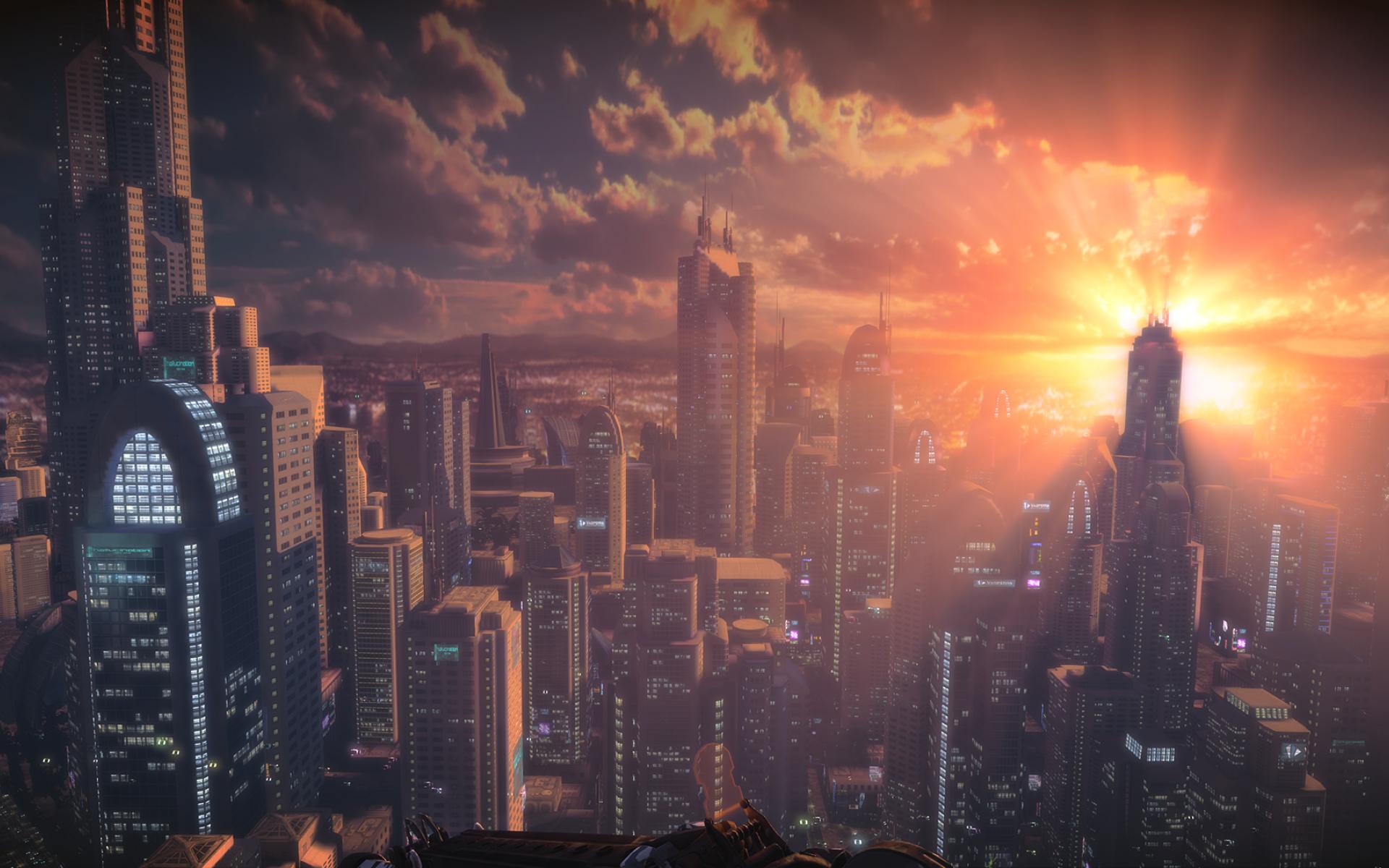 Обои Солнце на закате, Небоскреб, Цивилизация