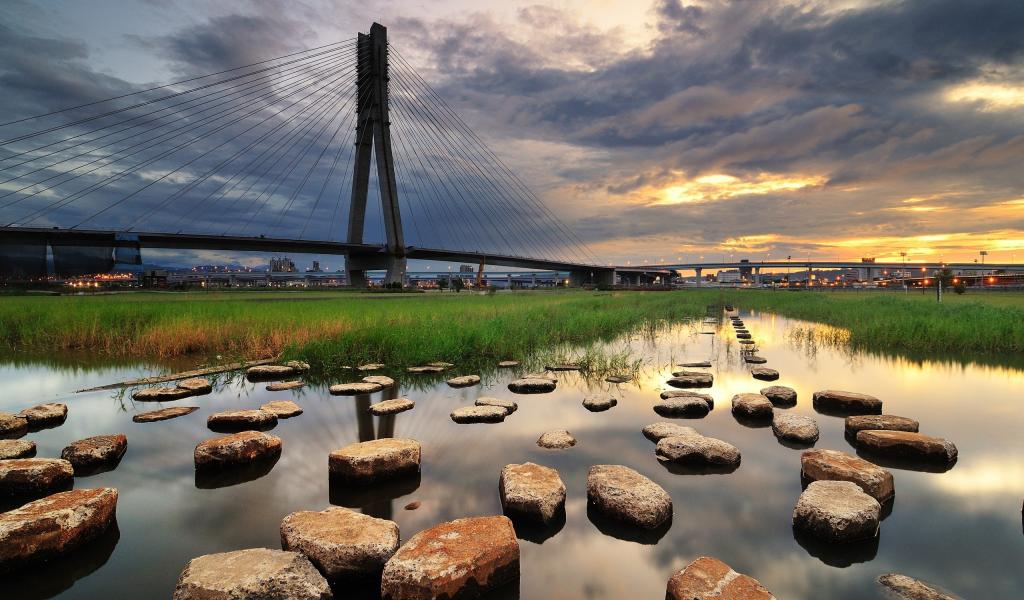 Обои Зеленая трава, Вода, Мост, Камни
