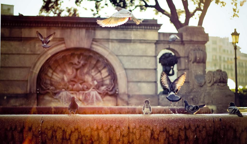 Обои Брызги, Фонтан, Голуби