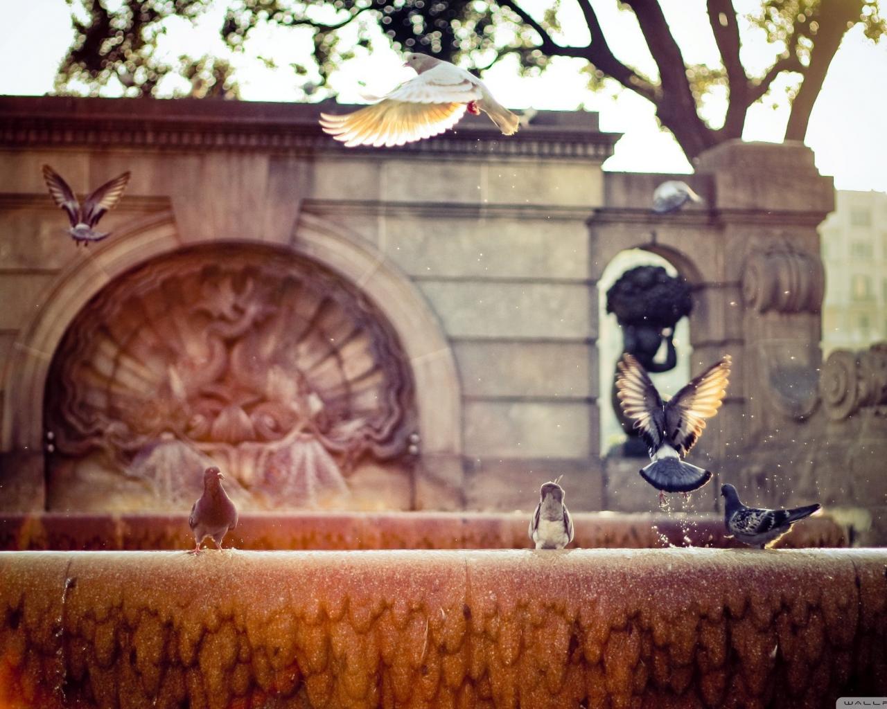 Обои Брызги, Фонтан, Голуби
