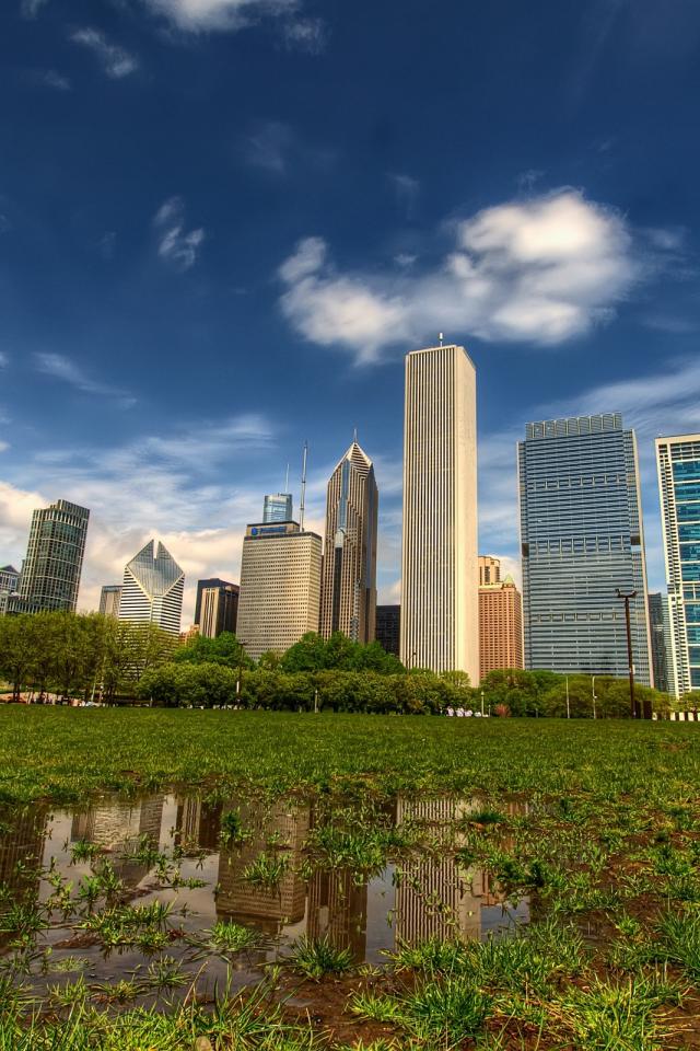 Обои Зеленая трава, Небоскреб, Лужа