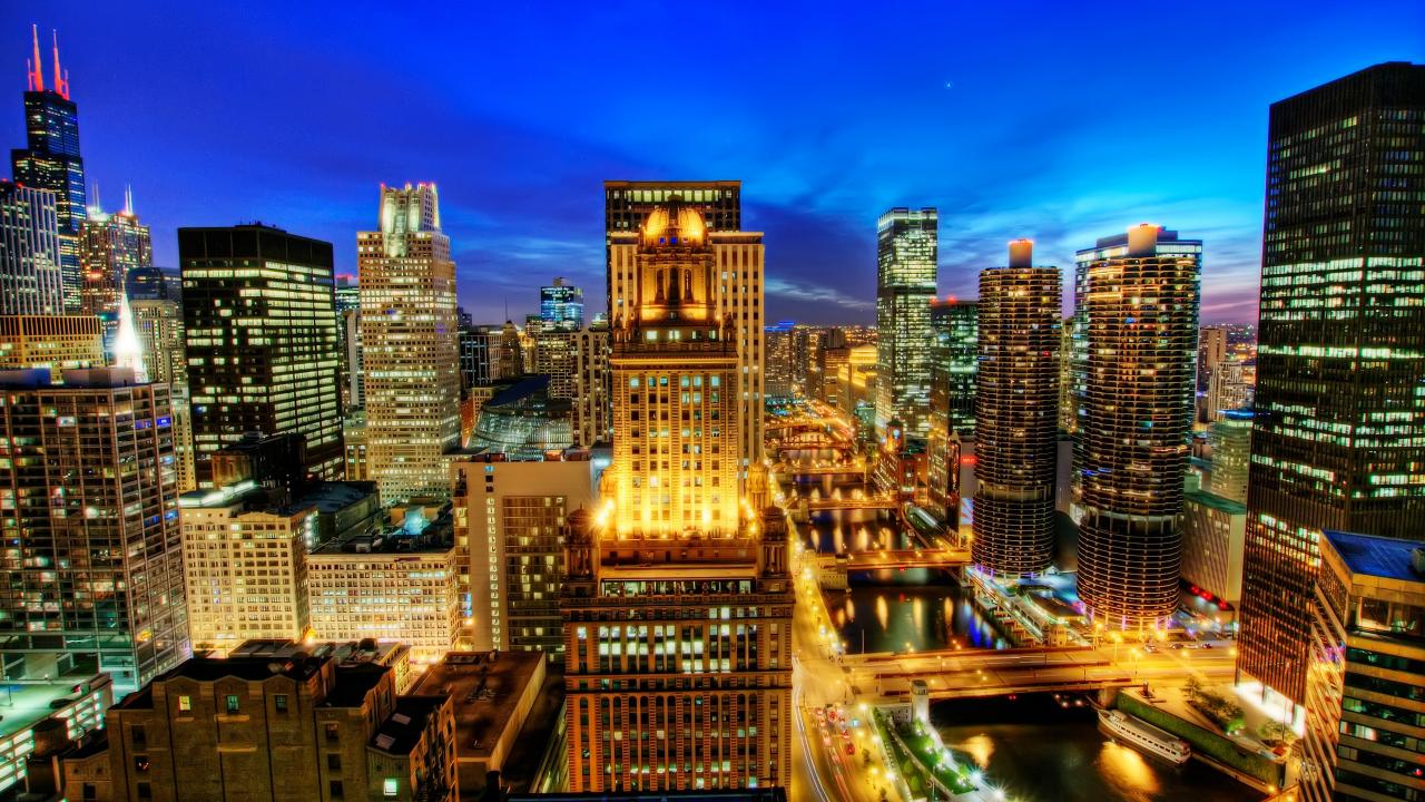 Обои Ночной город, Огни, Голубое небо, Чикаго