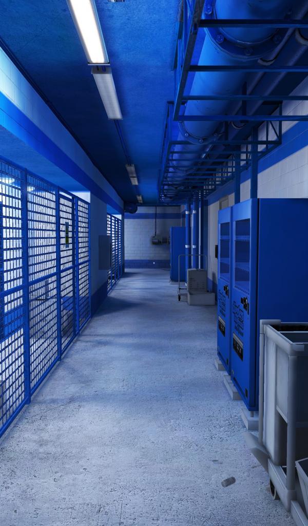 Обои Голубой интерьер подвала, игра Mirror`s Edge