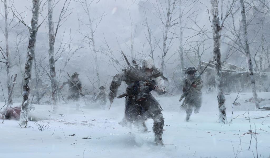 Обои Солдаты в зимнем лесу в игре Assassin`s Creed