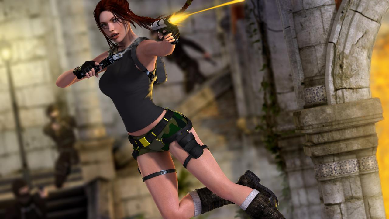 Обои Лара стреляет в прыжке