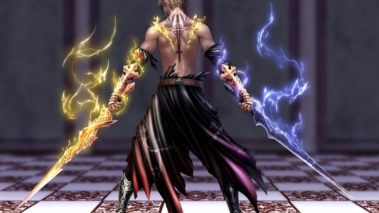 Обои Воин с огненными мечами, фэнтези