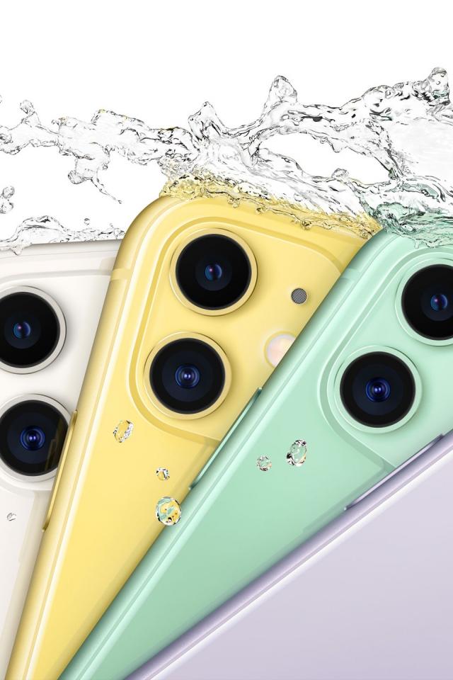 Обои Разноцветные iPhone 11 на белом фоне в каплях воды